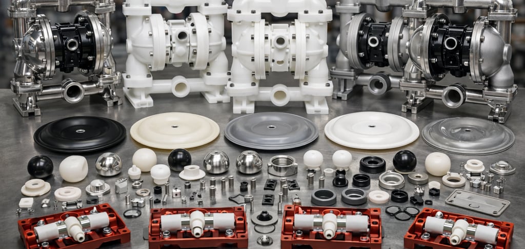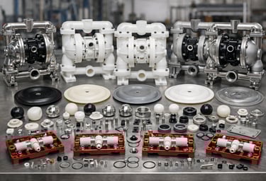 Kits de reparación y componentes internos (diafragmas, asientos, bolas) originales NOMAD® y 100% compatibles con las marcas líderes del mercado: Wilden®, Sandpiper® y Versa-Matic®.